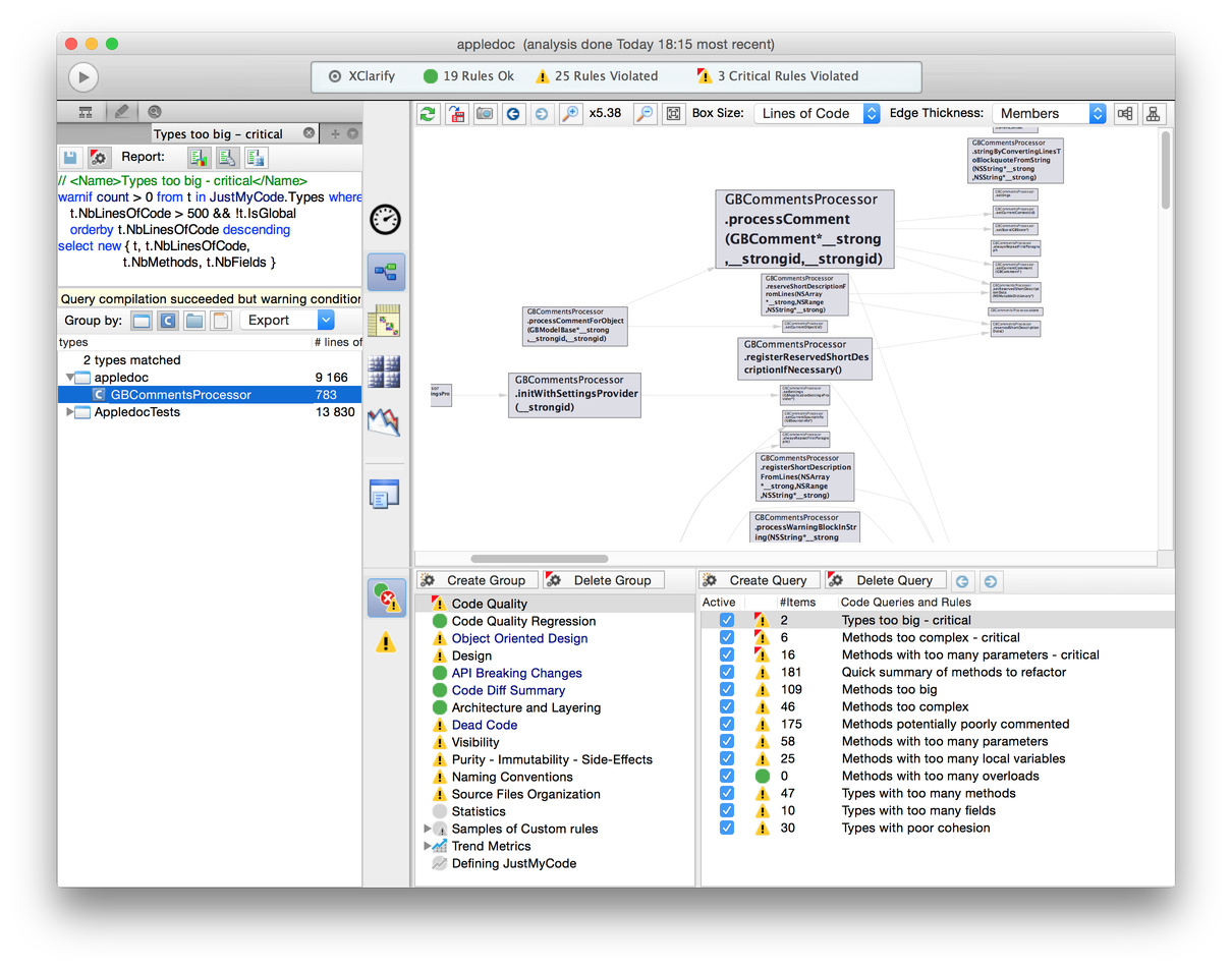 Other than defining code issues, XClarify also determines various statistics such as lines of code, lines of comments, number of types, classes, protocols, methods, third party projects etc. You can also export almost all views to HTML - for embedding on your website for example.